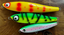 - 木製品のため吸水した場合、ヒビワレや塗装が剥がれることがあります。使用後はルアーと金属部分を十分に真水 で塩分や汚れを水洗いし、日陰に干し自然乾燥させ後、傷などがある場合は瞬間接着剤等で目止め補修してください。