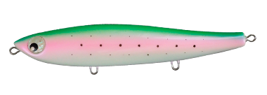 操作しやすいボディー形状とウッドプラグ特有の質量のある強い水押しとそれに伴う水しぶきでコノシロなどの大きなベイトを捕食しているビッグターゲットにアピールします。